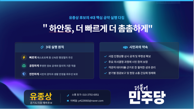 유 예비후보는 이날 발표에서 교통·주거·보상·돌봄을 중심으로 한 종합 발전 전략을 제시하며 “하안동의 내일을 실질적으로 바꾸는 실행 중심 정치”를 강조했다.