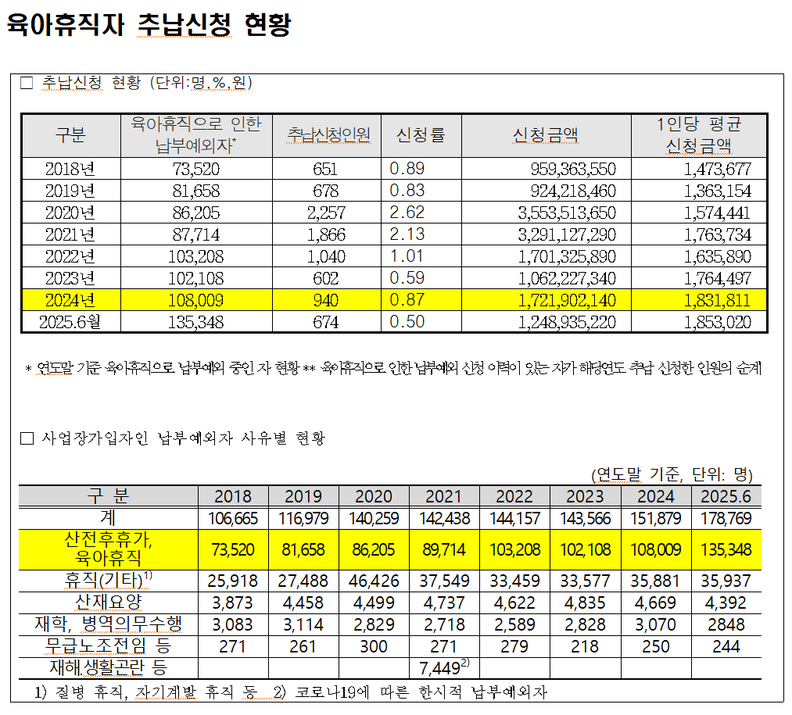 2024년 기준 육아휴직자들의 복귀 후 연금보험료 추가납부 신청률은 1%에도 못 미쳤다. 이에, 개정안은 육아휴직 기간의 연금보험료를 본인이 100% 부담해야 했던 불합리한 구조를 개선하여, 남녀휴직자의 경제적 부담을 덜어주고 육아로 인한 연금 사각지대 해소를 위한 법적 근거를 마련했다.