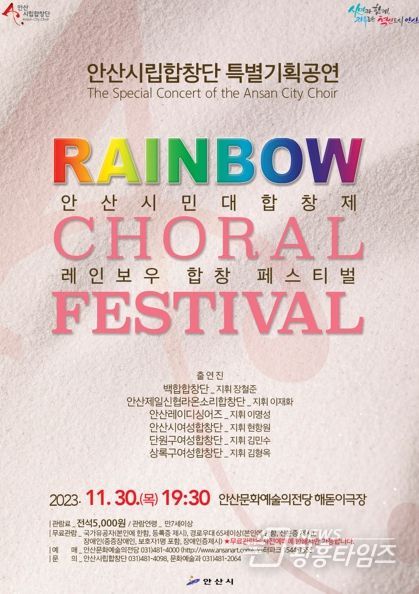 [광흥타임즈 = 조수제 기자] 안산시는 오는 30일 안산문화예술의전당 해돋이극장에서 안산시립합창단 특별기획공연‘안산시민대합창제-Rainbow Choral Festival’을 개최한다고 25일 밝혔다.