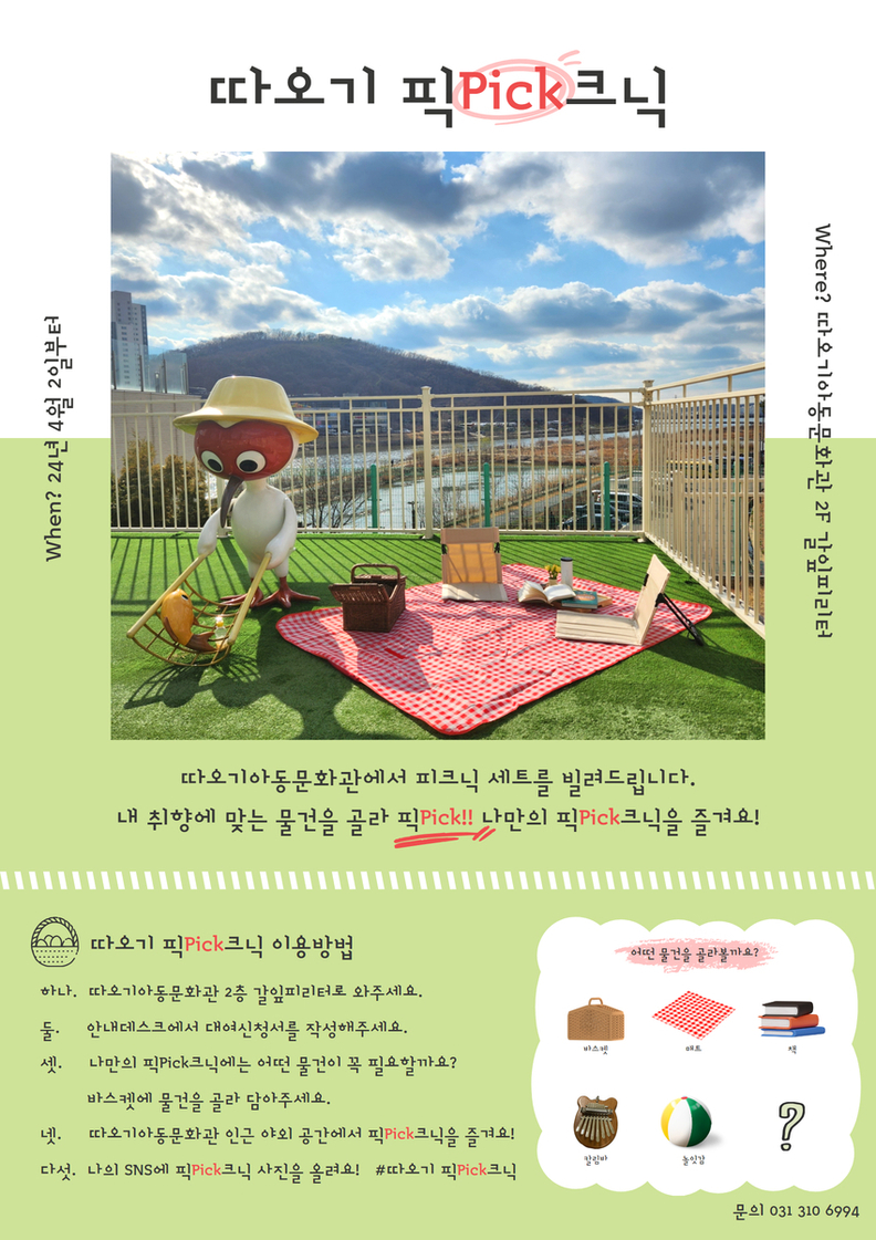 ‘픽pick크닉’은 ‘고르다(Pick)’와 ‘소풍(Picnic)’을 합친 조어로, ‘따오기 픽pick크닉’은 바구니, 돗자리, 책, 악기(칼림바), 놀이도구 등으로 구성된 문화 나들이 꾸러미를 제공해 가족들이 야외에서 문화 및 여가를 즐길 수 있도록 하는 따오기아동문화관의 상설 프로그램이다.