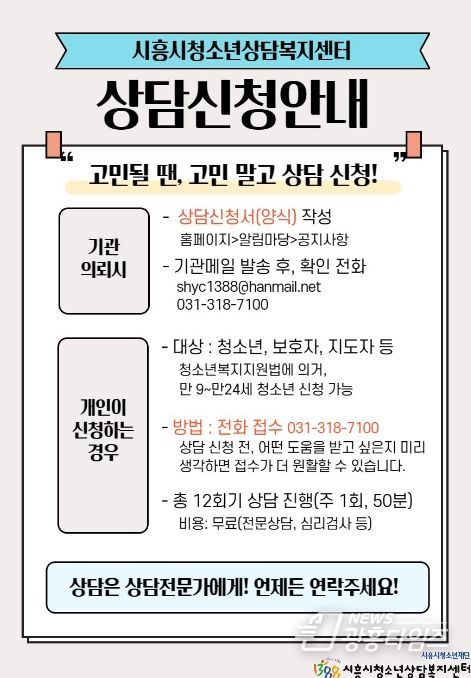 [광흥타임즈 = 조수제 기자] (재)시흥시청소년재단은 시흥시 청소년의 심리 건강을 촉진하기 위해 시흥시청소년상담복지센터를 운영하고 있다.