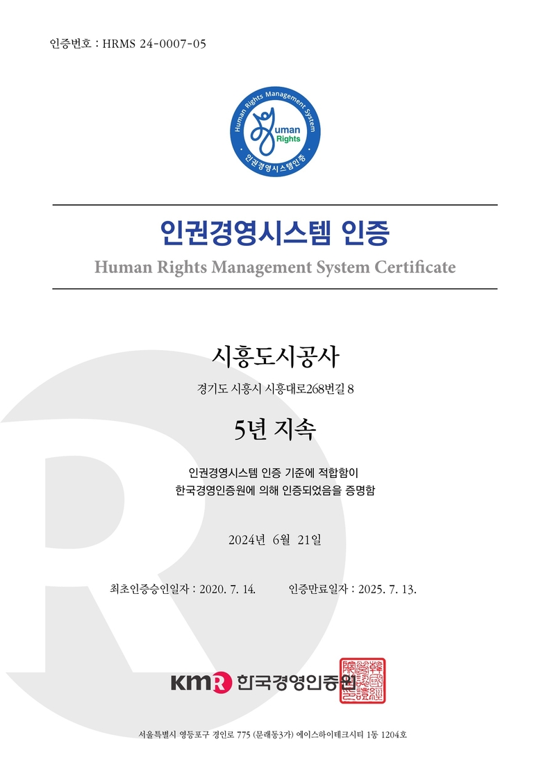 [광흥타임즈 = 조수제 기자] 시흥도시공사는 한국경영인증원(KMR)으로부터 5년 연속 인권경영시스템 인증을 획득했다고 21일 밝혔다.