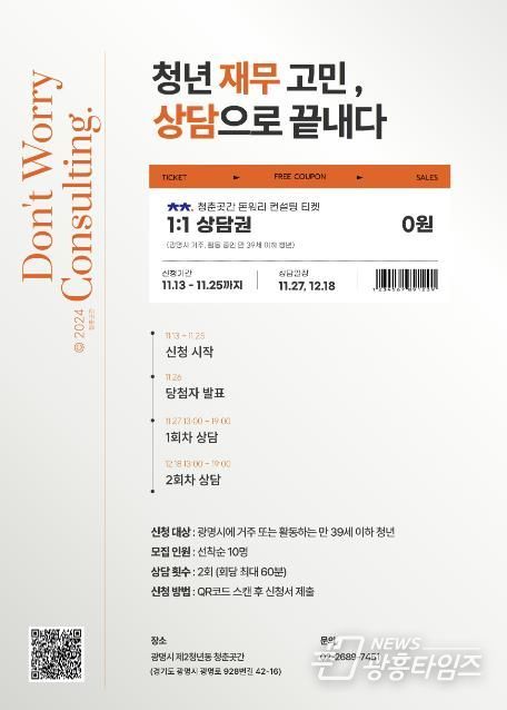 ‘돈워리 컨설팅’은 대면과 비대면 상담을 함께 운영한다. 대면 상담을 희망하는 참여자는 광명시 청춘곳간을 방문해 진행할 수 있으며, 온라인 비대면 상담도 가능해 시간 제약이 있는 청년들도 쉽게 참여할 수 있다.
