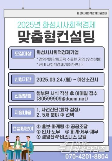 [광흥타임즈 = 구민지 기자] 화성특례시가 ‘2025년 화성시 사회적경제 맞춤형 컨설팅 사업’으로 화성시 사회적경제기업의 1:1 맞춤형 지원에 나선다.
