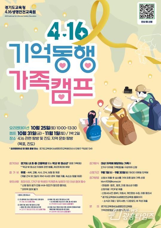 [광흥타임즈 = 조수제 기자] 경기도교육청4.16생명안전교육원이 도내 초, 중, 고등학생 또는 학교 밖 청소년을 대상으로 '4.16 기억 동행 가족 캠프' 참가자를 모집한다.