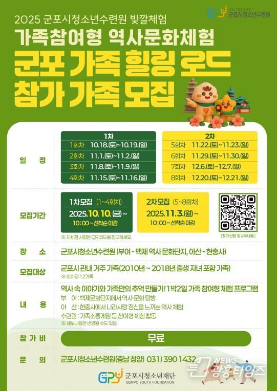 [광흥타임즈 = 조수제 기자] 군포시청소년재단이 운영하는 군포시청소년수련원(충남 청양)은 관내 가족을 대상으로 2025년 가족참여형 역사문화탐방 '군포가족 힐링로드' 참가자를 모집한다.