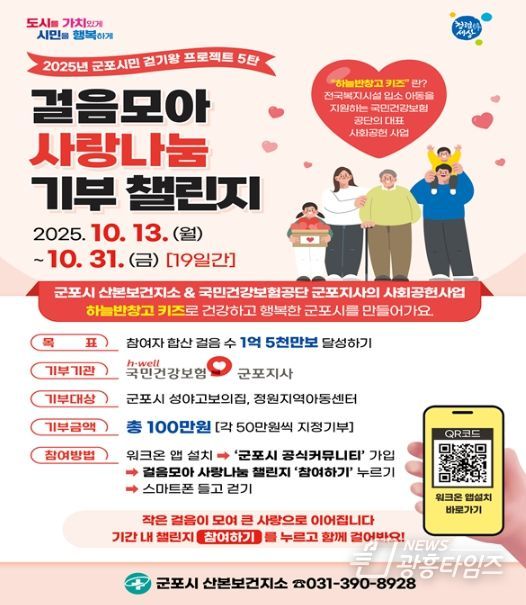 [광흥타임즈 = 조수제 기자] 군포시 산본보건지소는 오는 10월 13일부터 31일까지(19일간) 국민건강보험공단 군포지사와 함께하는 '걸음모아 사랑나눔' 기부챌린지를 운영한다.