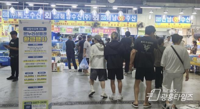 이번 행사는 해양수산부 지원으로 수산물 소비촉진과 도매시장 이용 활성화를 위해 마련된 것으로, 수산동 26개 점포가 참여해 국내산 수산물 구매 시 구매금액의 일부를 온누리상품권으로 즉시 환급하는 혜택을 선보였다.