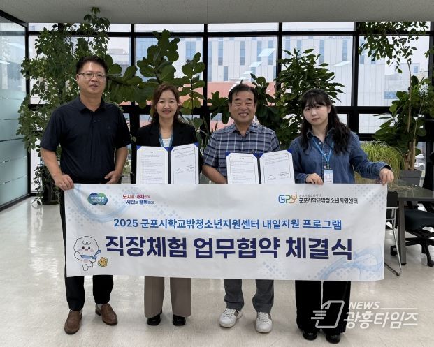 [광흥타임즈 = 조수제 기자] 군포시청소년재단(대표이사 김덕희), 군포시학교밖청소년지원센터(센터장 강연미)는 시각디자인 분야로의 진학과 진로를 희망하는 학교 밖 청소년을 지원하기 위해 관내 디자인 전문업체인 ㈜은진과 직장체험 업무협약을 체결했다고 밝혔다.