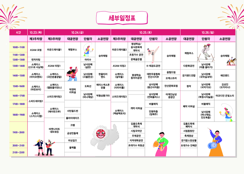 축제 둘째날인 24일에는 안산 와~스타디움 보조경기장에서 ‘제14회 장애학생 체육대회’가 열린다. 관내 장애학생들이 육상·풋살·한궁 등 다양한 종목에서 기량을 펼치며 화합과 도전의 의미를 더한다. 또한 화랑유원지 야외공연장에서는 시민과 청년이 함께 즐기는 ‘Rock · 樂 페스타’가 개최되며 가을밤을 뜨겁게 달굴 예정이다.