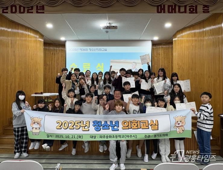 [광흥타임즈 = 조수제 기자] 경기도의회 건설교통위원회 안명규 의원(국민의힘, 파주5)은 10월 21일 파주송화초등학교 시청각실에서 열린 ‘제36회 청소년의회교실’에 참석해 파주 송화초등학교 학생들과 함께 모의의회를 체험하며 민주주의의 가치와 의회의 역할을 함께 나누는 뜻깊은 시간을 가졌다.
