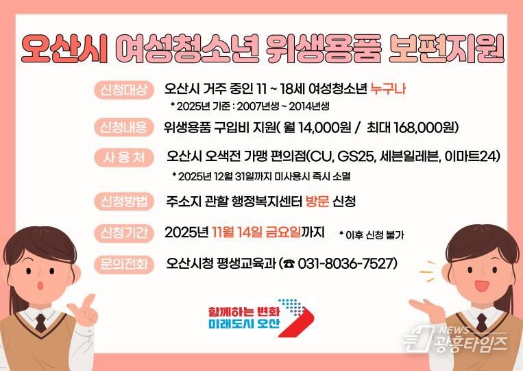 [광흥타임즈 = 조수제 기자] 오산시는 여성청소년의 건강권 보장과 보편적 복지 실현을 위해 올해 처음 시행한 ‘여성청소년 위생용품 보편지원사업’의 신청을 오는 11월 14일 마감한다. 아직 신청하지 않은 대상자는 혜택을 받을 수 있도록 서둘러 참여해야 한다.