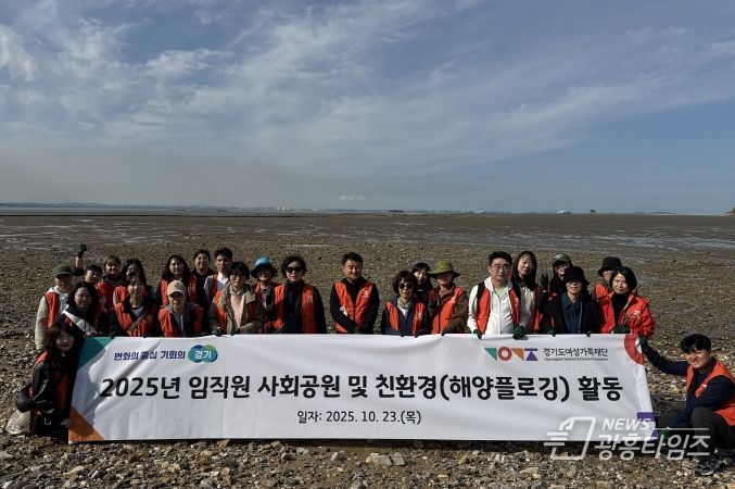 [광흥타임즈 = 조수제 기자] 경기도여성가족재단은 23일 화성시 고온항 및 궁평항 일대에서 임직원 36명이 참여한 가운데 ‘2025년 사회공헌 및 친환경 활동’(해양 플로깅)을 펼쳤다.