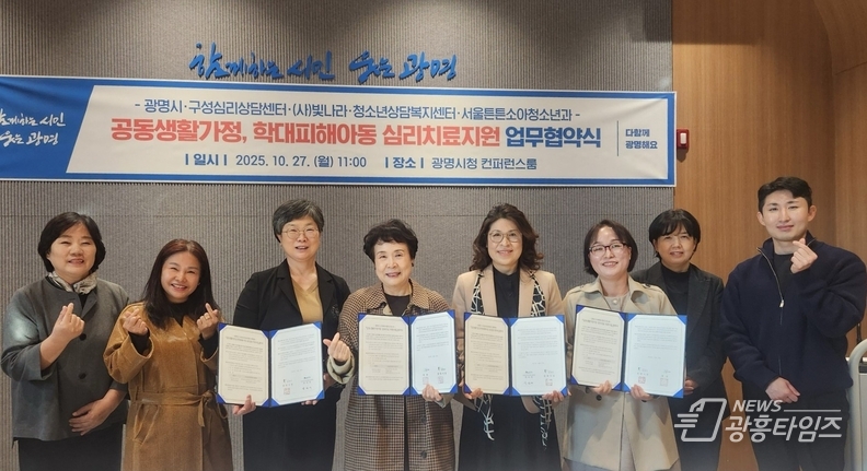 시는 지난 27일 시청 컨퍼런스룸에서 사회복지법인 빛나라, 구성심리상담센터 광명점, 광명시청소년상담복지센터, 서울튼튼소아청소년과의원과 ‘공동생활가정 및 학대피해 아동 심리치료·후원연계·의료지원 관련 업무협약’을 체결했다.