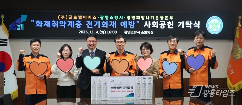 [광흥타임즈 = 조수제 기자] 광명소방서는 11월 4일 오후 4시, 광명소방서 2층 소회의실에서 (주)글로벌이지스, 광명희망나기운동본부와 함께 사회공헌 기탁식을 진행했다고 밝혔다.
