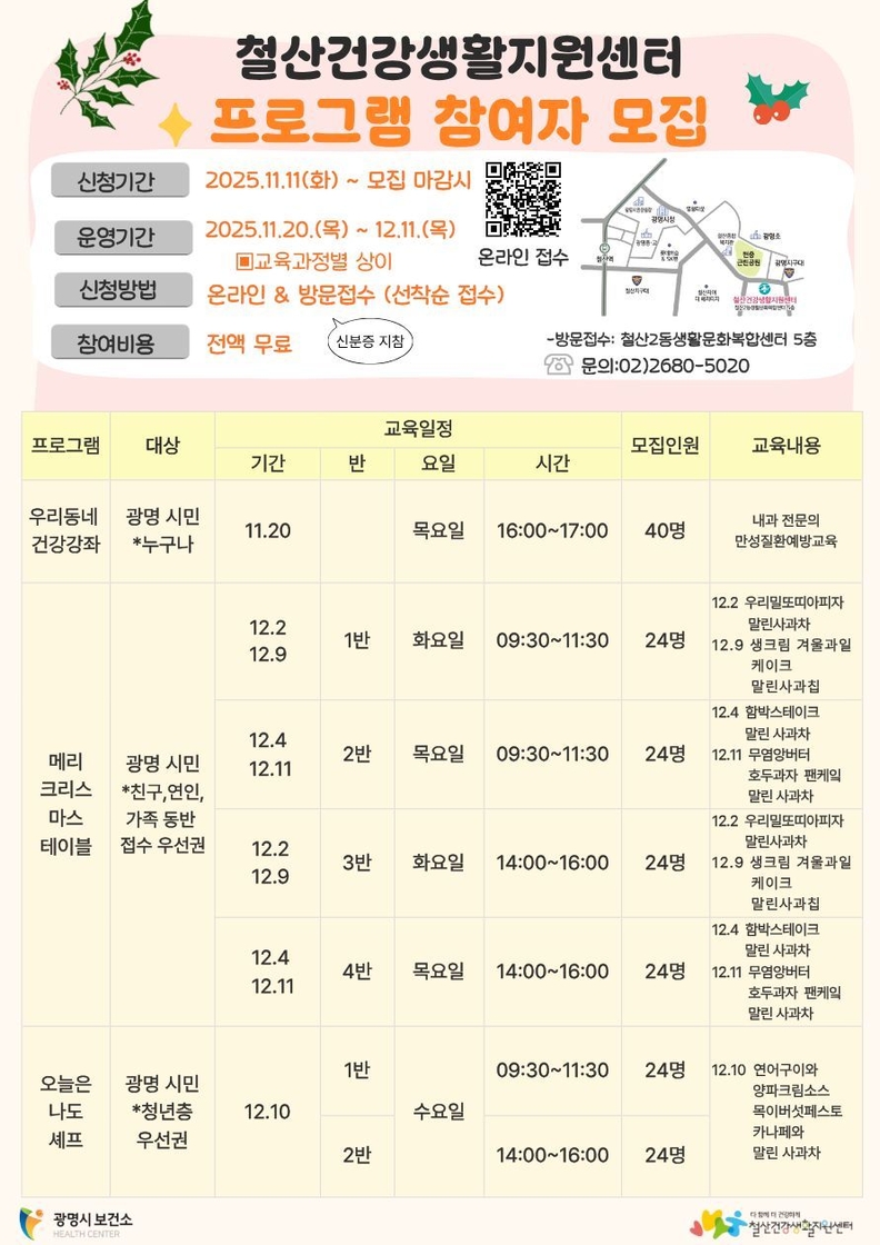 두 프로그램은 모두 오는 11월 11일부터 선착순으로 광명시 평생학습 통합플랫폼 ‘광명e지’에서 온라인으로 신청하거나 철산2동 생활문화복합센터 5층에 방문해 신청할 수 있으며, 참여비는 무료다.