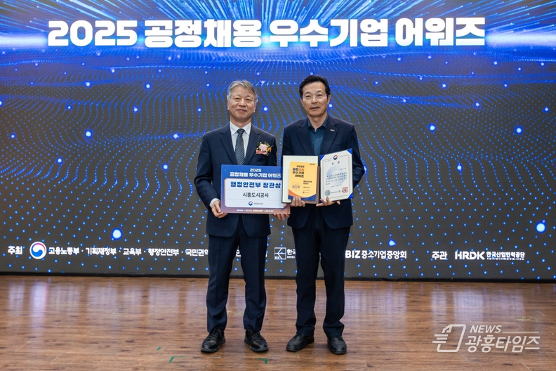 [광흥타임즈 = 조수제 기자] 시흥도시공사는 지난 7일 ‘2025년 공정채용 우수기업 어워즈’ 시상식에서 공공기관 부문 우수기관으로 선정되어 행정안전부 장관상을 수상했다.
