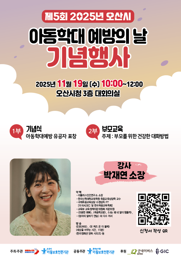 박현주 아동복지과장은 “이번 행사가 아동학대 예방의 중요성을 되새기고 아이들에게 더 따뜻한 관심을 보내는 계기가 되길 바란다”며 “작년에 이어 올해도 박재연 소장을 모신 것은 부모교육의 연속성과 효과를 높이기 위한 것으로, 학부모와 시민들에게 실질적으로 도움이 되는 교육이 될 것으로 기대한다”고 말했다.
