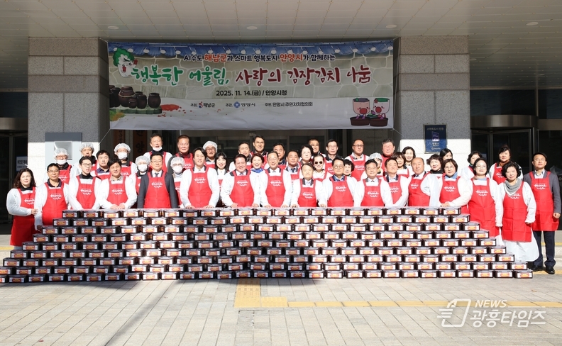 [광흥타임즈 = 조수제 기자] 안양시는 14일 오전 10시30분 안양시청 앞마당에서 청정지역 전남 해남군과 함께 따뜻한 마음을 나누는 ‘2025년 김장김치 나눔행사’를 개최하고, 상호 우의를 다지는 고향사랑기부금 전달식을 가졌다.