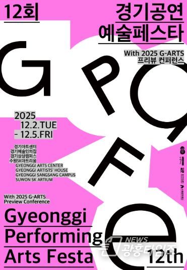 [광흥타임즈 = 조수제 기자] 경기문화재단은 경기도 수원 일대에서 제12회 경기공연예술페스타를 개최한다. 페스타는 2025년 12월 2일부터 5일까지 경기 예술인의 집, 경기아트센터, 경기상상캠퍼스, 수원SK아트리움 등에서 진행되며, 베스트콜렉션, 쇼케이스 데이, 공동 창·제작 쇼케이스, 피치세션, 토크세션, 워크숍 등 다양한 프로그램을 통해 경기 공연예술 생태계의 흐름과 성과를 한눈에 보여줄 예정이다. 또한 경기아트센터 주최 ‘2025 G-ARTS 프리뷰 컨퍼런스’가 동시 개최되며, 보다 풍성한 전문 교류의 장을 마련한다.