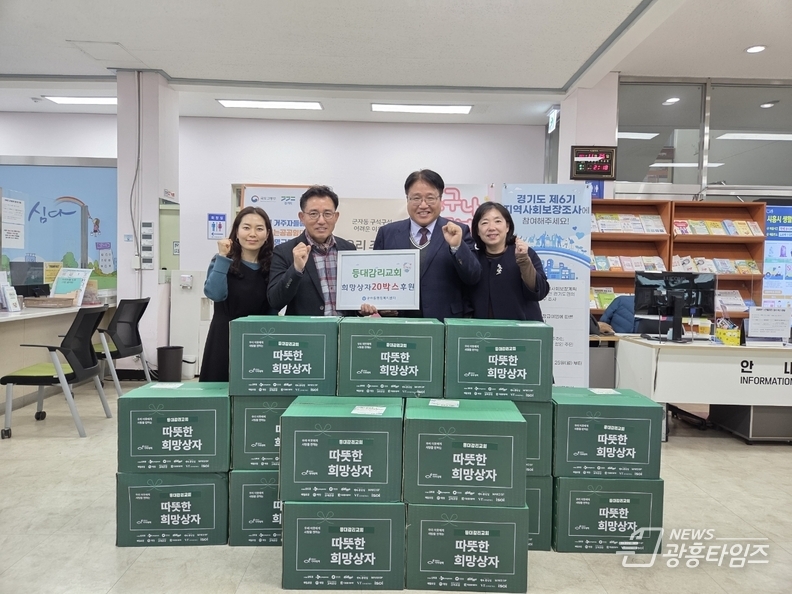 [광흥타임즈 = 조수제 기자] 시흥시 군자동에 있는 등대감리교회가 국제구호 NGO ‘희망친구 기아대책’과 함께 지난 11월 25일 군자동 행정복지센터에 20개의 희망 상자(200만 원 상당)를 기부했다.