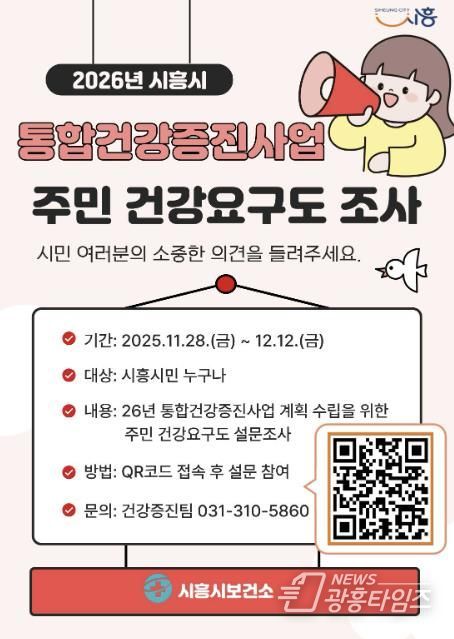 [광흥타임즈 = 조수제 기자] 시흥시는 2026년 지역사회 통합건강증진사업 계획 수립을 위해 오는 12월 12일까지 지역 주민을 대상으로 보건의료서비스 전반에 관한 주민 건강요구도 조사를 실시한다.