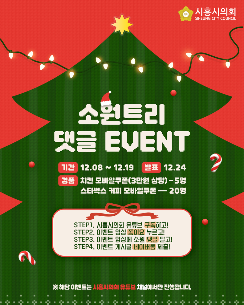 이번 이벤트는 12월 8일부터 19일까지 12일간 시흥시의회 공식 유튜브 채널을 통해 진행되며, 시흥시민은 물론 시흥시의회 유튜브 구독자라면 누구나 참여할 수 있다.