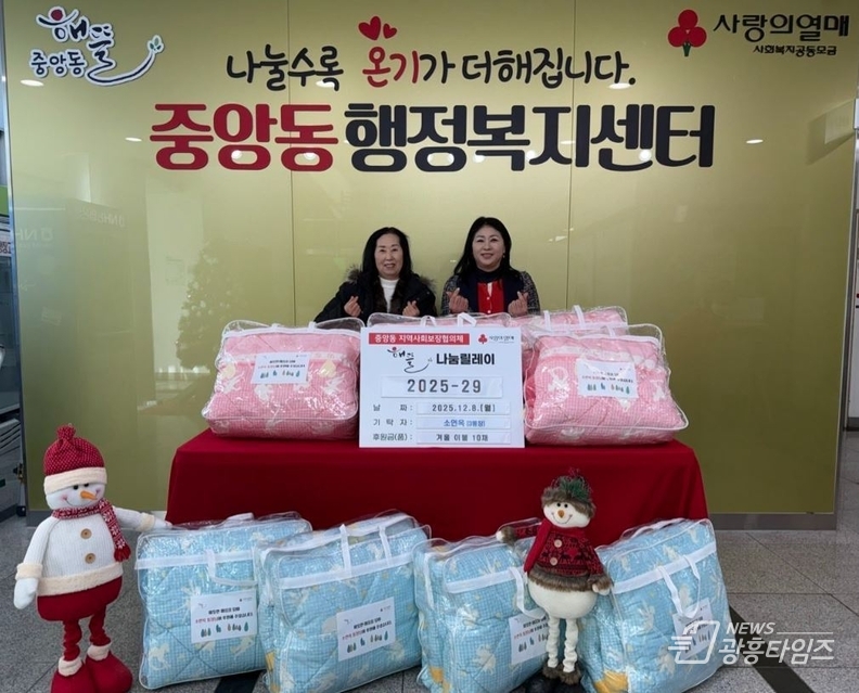 백경희 중앙동장은 “매년 이웃을 먼저 생각해 따뜻한 나눔을 실천해주시는 소연옥 통장님께 깊이 감사드린다”며 “기탁된 이불은 독거어르신 등 난방 취약 가정에 신속히 전달해 겨울철 복지 보호에 만전을 기하겠다”고 전했다.
