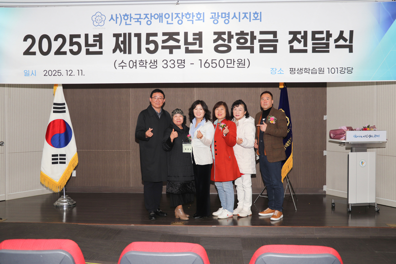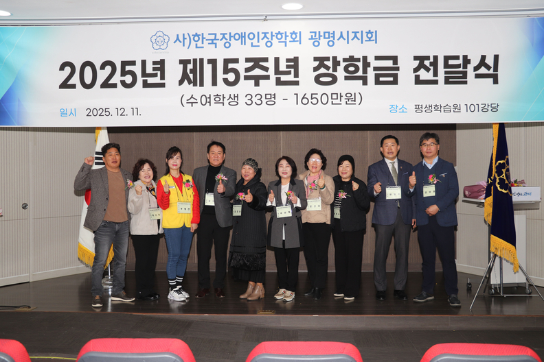이동열 광명시 장애인복지과장은 “지난 15년간 장학회가 실천해 온 나눔은 단순한 지원을 넘어, 지역사회가 ‘우리 아이들을 끝까지 책임지겠다’는 선언이었다”며 “오늘 장학금을 받는 학생들은 어려움을 이겨내고 꾸준히 성장해 온 자랑스러운 주인공들”이라고 격려했다.