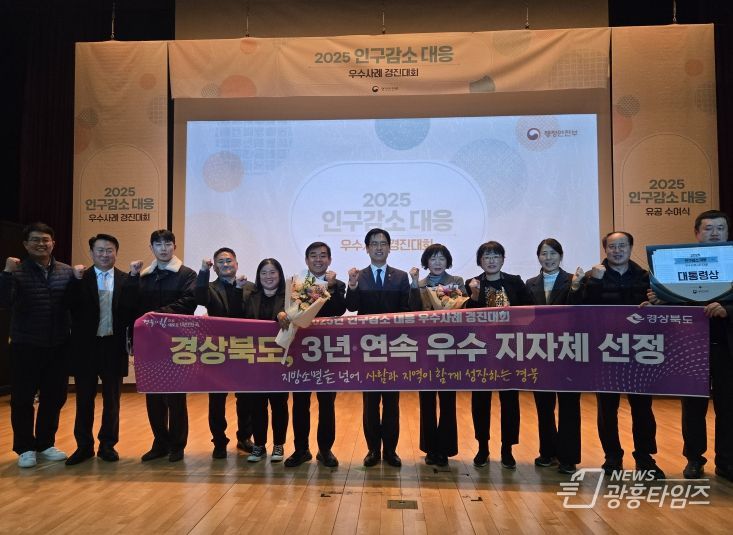 [광흥타임즈 = 조수제 기자] 경상북도가 행정안전부 주관 ‘2025년 인구감소대응 우수사례 경진대회’에서 지역 기반 이민정책으로 대통령상을 받으며, 3년 연속 인구 감소 대응 우수기관으로 선정됐다.