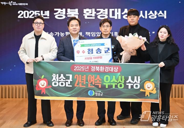 [광흥타임즈 = 조수제 기자] 청송군은 22일 열린 ‘2025년 경북환경대상’에서 2년 연속 우수상을 수상했다고 밝혔다.