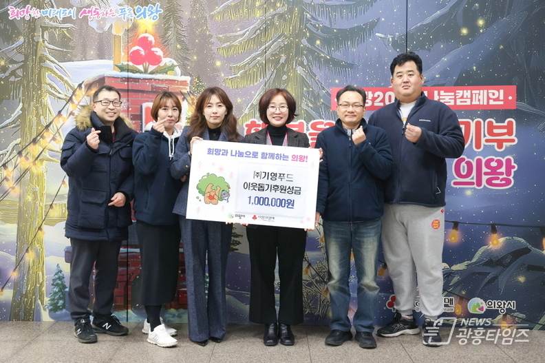 [광흥타임즈 = 구민지 기자] 의왕시가 12월 22일 (주)기영푸드로부터 어려운 이웃을 돕기 위한 성금 100만원을 기부받았다고 밝혔다.