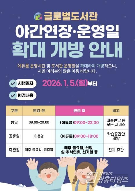 또한, 글로벌도서관은 기존 공휴일에 운영되지 않던 에듀룸 학습공간을 오전 9시부터 오후 6시까지 개방해 학생과 시민들의 안정적인 학습 활동을 지원할 계획이다.