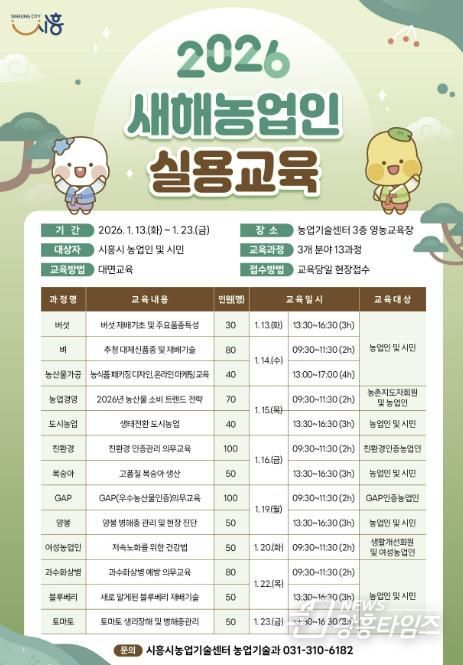 [광흥타임즈 = 조수제 기자] 시흥시는 농업인의 전문역량 강화와 안정적인 영농 활동을 지원하기 위해 ‘2026년 새해농업인 실용교육’을 오는 1월 13일부터 23일까지 시흥시농업기술센터 3층 영농교육장에서 운영한다.