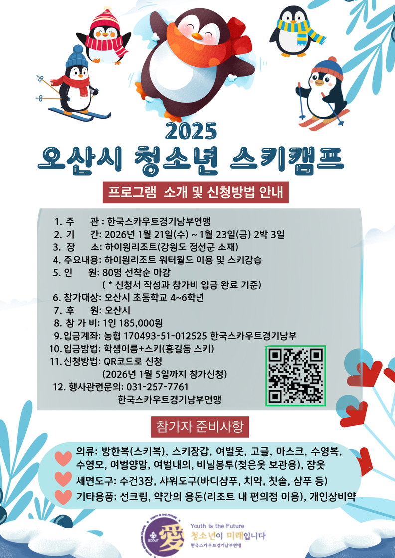 캠프는 한국스카우트경기남부연맹이 주관해 2026년 1월 21일부터 23일까지 2박 3일간 강원도 정선군 하이원리조트에서 진행된다. 전문 강사의 체계적인 스키 강습을 비롯해 워터월드 체험 등 겨울방학에 어울리는 다양한 프로그램으로 구성됐으며, 인솔 지도자는 전원 스카우트 지도자로 편성하고 야간 당직 지도자를 별도로 배치하는 등 안전 관리에도 만전을 기할 예정이다.
