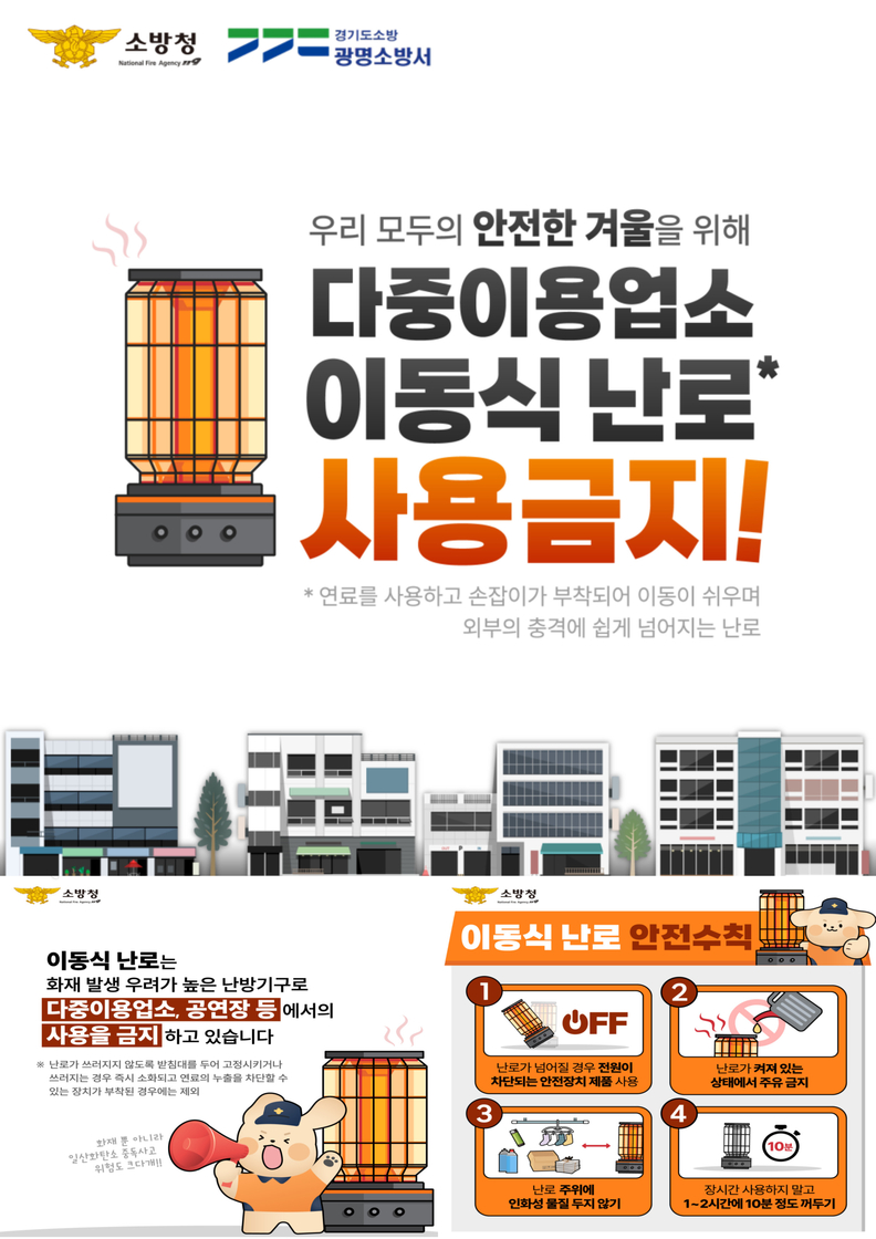 이에 광명소방서는 화재 저감을 위해 이동식 난로 및 온열기구 사용 시 ▲난로 주위 인화성 물질 제거 ▲전도·과열 시 전원이 차단되는 안전장치가 있는 제품 사용 ▲난로 사용 중 주유 금지 등 안전 수칙을 강조했다.