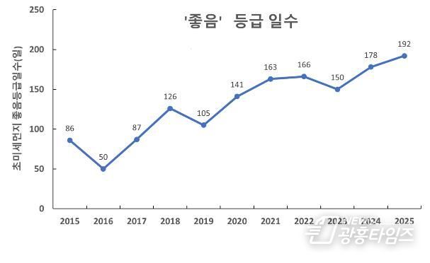 31개 시군 111개 도시대기측정소 측정 결과, 초미세먼지 ‘좋음’ 등급 일수도 종전 최저치였던 2024년(178일)보다 14일 늘어난 192일로 집계됐다. 대기환경 기준 초미세먼지 농도가 15μg/m3 이하일 때 ‘좋음’ 등급으로 분류한다.