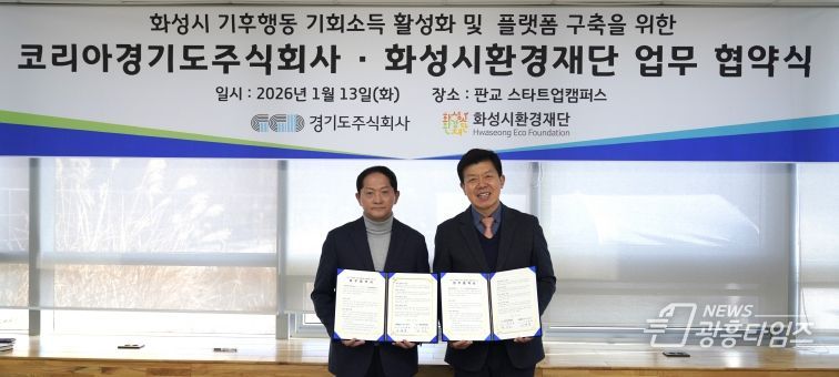 [광흥타임즈 = 조수제 기자] 경기도주식회사는 13일 경기도 성남시 판교 스타트업캠퍼스에서 화성시환경재단과 ‘기후행동 기회소득 활성화 및 화성시 플랫폼 구축을 위한 업무협약’을 체결했다.