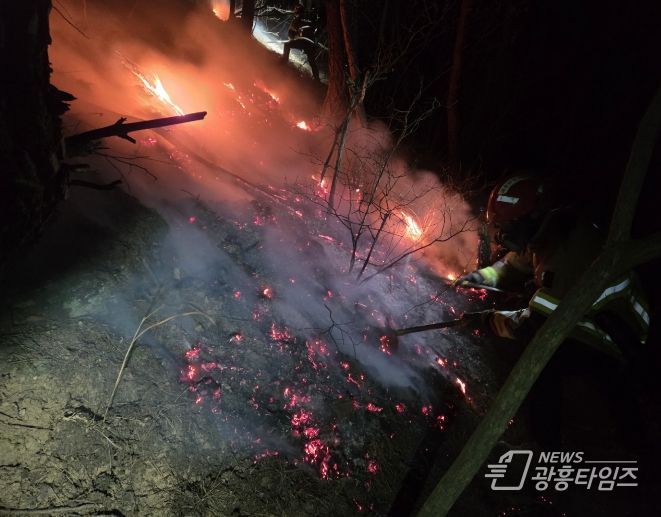[광흥타임즈 = 조수제 기자] 경상북도 소방본부가 10일 15시경에 발생한 의성군 의성읍 비봉리 일원 산불 현장에 ‘경북형 소방산불진화대’를 신속 투입해 산불 초기 진화와 확산 차단에 성공하며, 선제적 산불 대응 정책의 실효성을 입증했다.