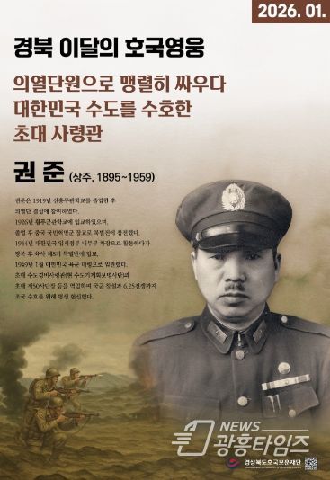 [광흥타임즈 = 조수제 기자] 경상북도호국보훈재단은 2026년‘경북 이달의 호국영웅’ 사업의 첫 주인공으로 독립운동가이자 대한민국 국방의 초석을 다진 상주 출신 권준(權晙, 1895~1959) 장군을 선정했다고 밝혔다.