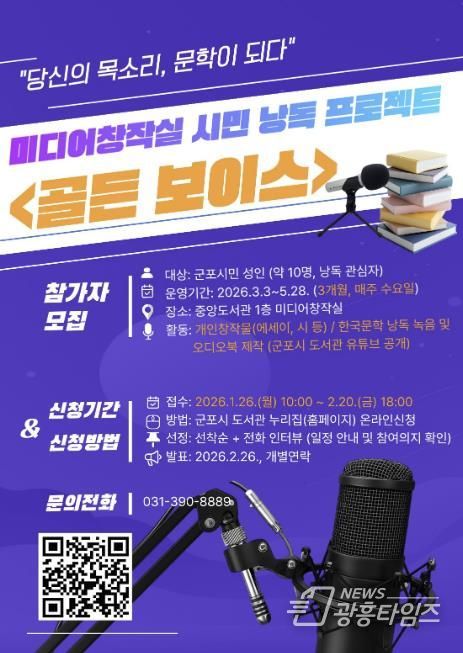 [광흥타임즈 = 조수제 기자] 군포시 중앙도서관은 시민이 직접 참여하는 낭독 콘텐츠 제작을 통해 공공 문화콘텐츠를 확산하고, 시민의 창작 경험을 지원하기 위해 미디어창작실 시민 낭독 프로젝트 '골든 보이스'를 운영한다.