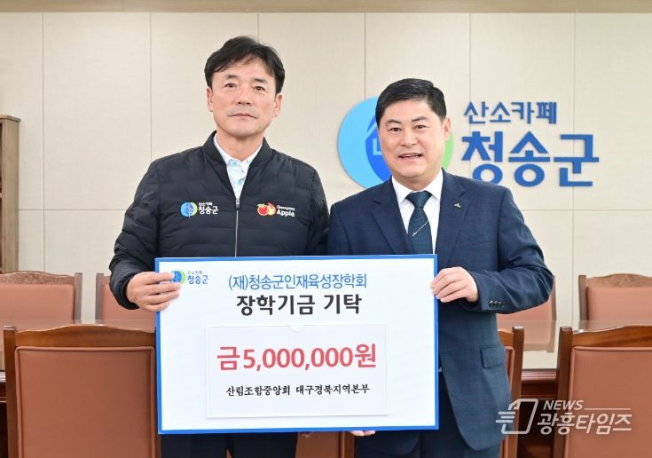[광흥타임즈 = 조수제 기자] (재)청송군인재육성장학회(이사장 윤경희)는 지난 20일과 22일 청송군산림조합(조합장 조승래)과 산림조합중앙회 대구경북지역본부(본부장 이달우)로부터 각각 500만 원씩 총 1,000만 원의 장학금을 기탁받았다고 밝혔다.