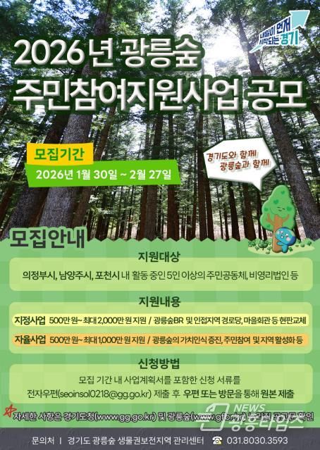 [광흥타임즈 = 조수제 기자] 경기도가 광릉숲 생물권보전지역 활성화를 위해 2026년 광릉숲 주민참여지원사업 참여자를 모집한다.