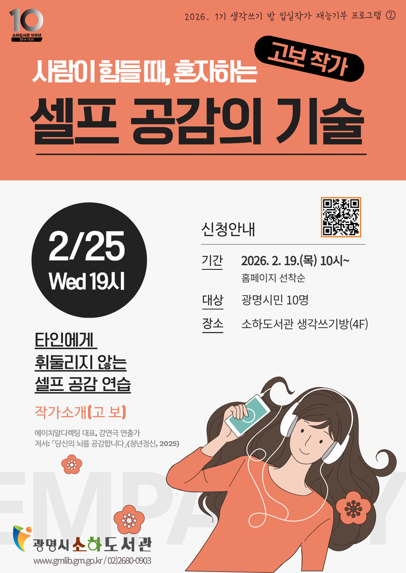 주요 프로그램으로는 ▲2월 20일 안미나 작가의 ‘동화 분야 전자책 출판 1:1 멘토링’을 시작으로 ▲2월 25일에는 고보 작가의 자기 이해와 공감을 돕는 ‘셀프 공감의 기술’ 강연이 열린다.