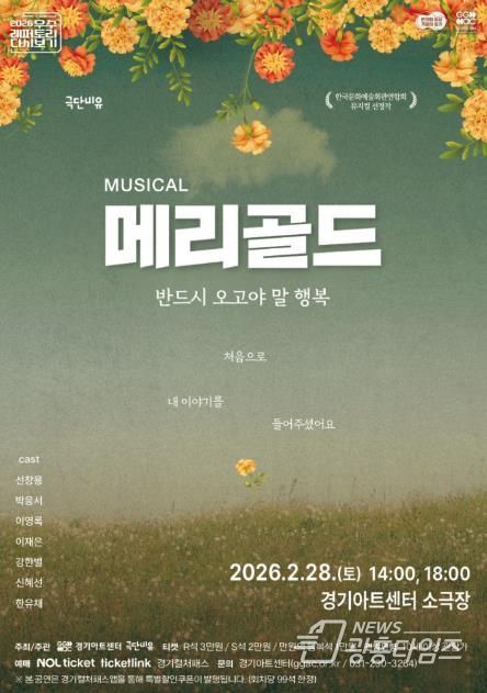 또, 경기아트센터 소극장에서 공연하는 뮤지컬 ‘메리골드’ 관람 할인 문화소비쿠폰이 지원된다. 공연은 오는 28일 토요일 오후 2시와 6시 총 2회 진행되며, 좌석 등급은 R석(3만 원), S석(2만 원), 만원의 행복석(1만 원)으로 구성된다.
