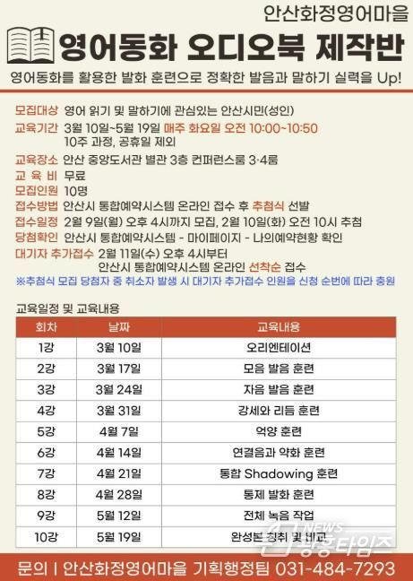 [광흥타임즈 = 조수제 기자] 안산시가 설립하고 안산대학교가 운영하는 안산화정영어마을이 성인 영어 학습자를 위한 ‘영어동화 오디오북 제작반’을 3월부터 5월까지 10주 과정으로 안산시 중앙도서관에서 운영한다고 4일 밝혔다.