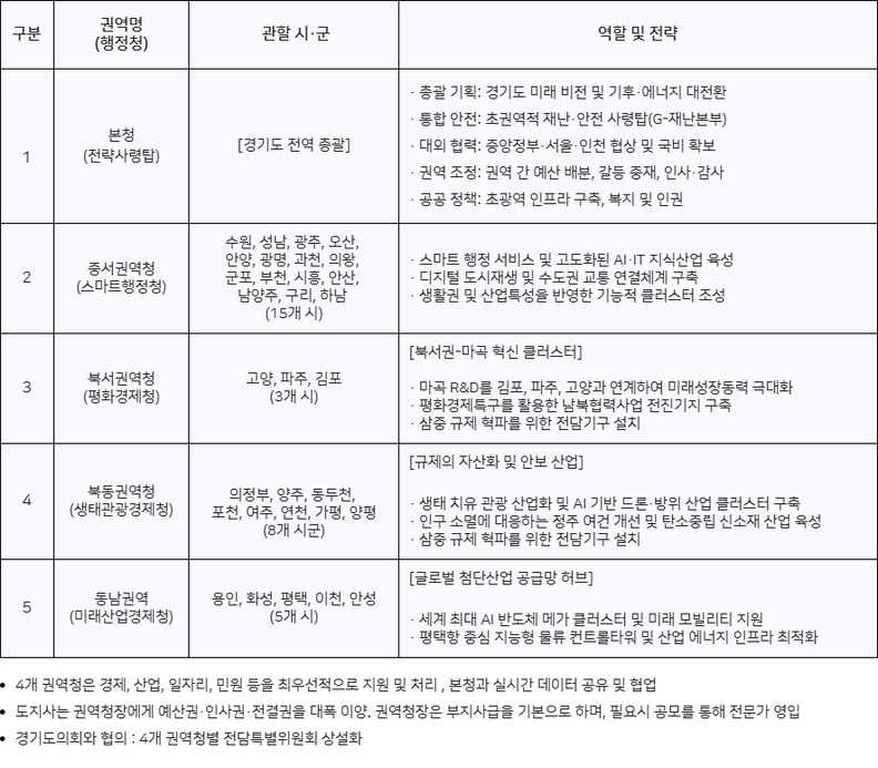 본청은 경기도 전체의 총괄기획, 통합안전, 대외협력(중앙정부 협의), 예산 및 갈등 조정, 초광역 인프라 구축을 책임지는 ‘전략사령탑’ 역할을 수행하겠습니다.