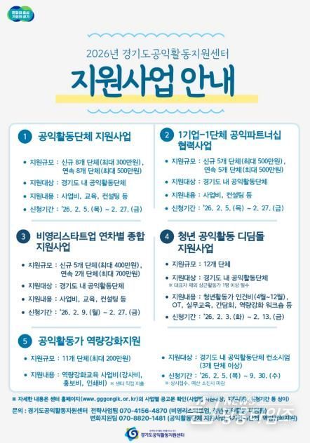 [광흥타임즈 = 조수제 기자] 경기도공익활동지원센터가 ‘2026년 경기도 공익활동 지원사업’에 참여할 도내 공익활동 단체를 모집한다.