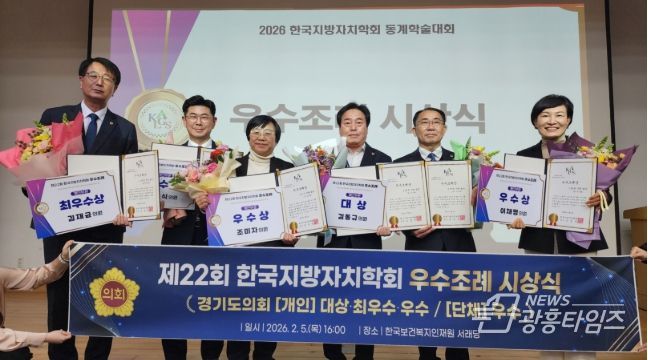[광흥타임즈 = 조수제 기자] 경기도의회가 5일 ‘제22회 한국지방자치학회 우수조례 시상식’에서 개인부문 대상과 단체부문 우수상 등 총 8건을 수상하며 전국 최고의 입법 역량을 입증했다.