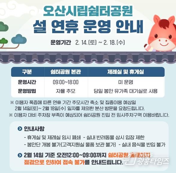 오산시립쉼터공원은 오전 9시부터 오후 6시까지 연중무휴로 운영된다. 다만, 2월 14일(토)부터 2월 18일(수)까지 5일간은 추모객 밀집으로 인한 안전사고 예방을 위해 휴게실 및 제례실은 임시 폐쇄된다. 또한 공원 내 질서 유지를 위해 음식물 반입 및 봉안 물품 안치가 제한되며, 반려동물 동반 입장도 금지된다. 오산도시공사는 이러한 운영 방침을 통해 쾌적하고 안전한 추모 환경을 조성할 계획이다.